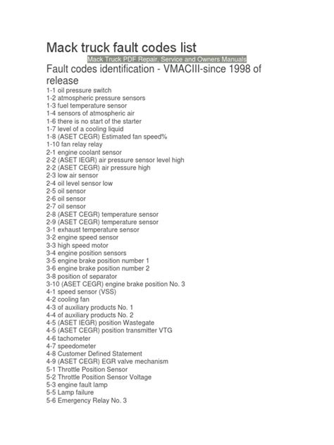 Read mack truck fault code 8 2 list pdf Reader online is a convenient and frugal way to read mack truck fault code 8 2 list pdf you love right from the comfort of your own home. Yes, there sites where you can get Reader "for free" but the ones listed below are clean from viruses and completely legal to use.